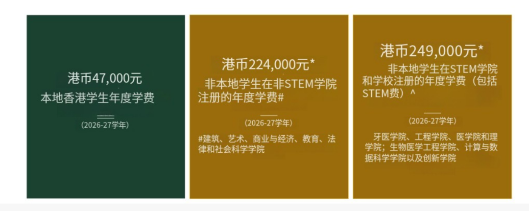 学费对比:根据最新数据,2026/27学年,香港大学本地生学费为47000港币/年,而非本地生学费则分为两档:非STEM学院218000港币/年,STEM学院高达243000港币/年。