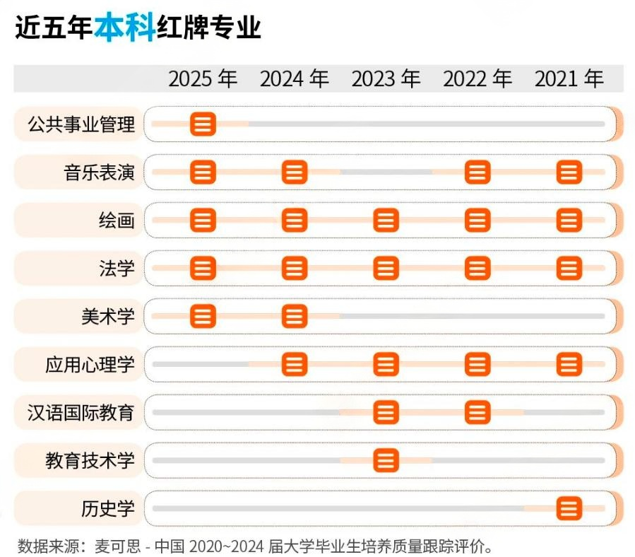 如2025年本科红牌专业包括:公共事业管理、音乐表演、绘画、法学、美术学