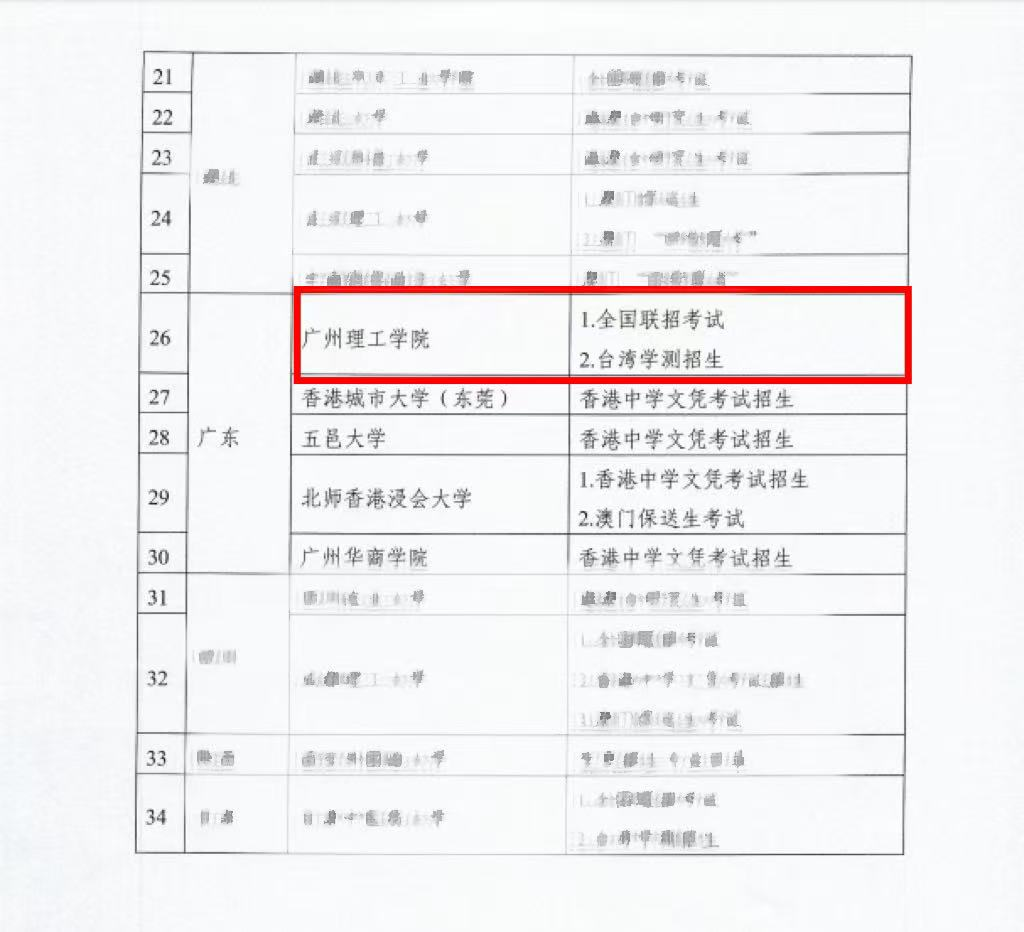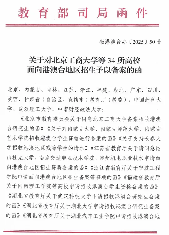 教育部港澳台事务办公室发布的这份文件,是港澳台联考政策中的重要一环。文件对北京工商大学等34所高校面向港澳台地区招生予以备案。