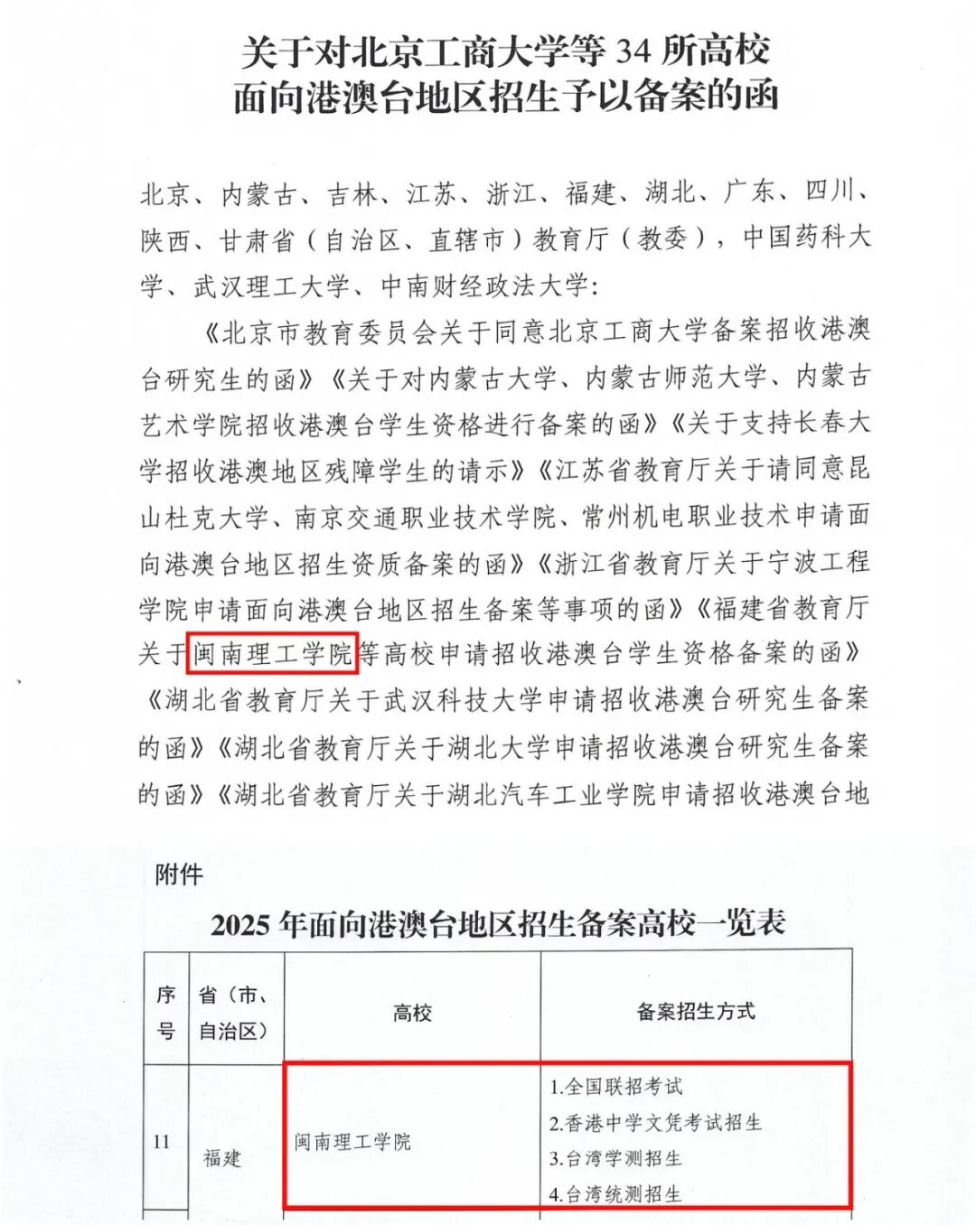 近日,教育部港澳台事务办公室正式发布《关于对北京工商大学等34所高校面向港澳台地区招生予以备案的函》。其中闽南理工学院、泉州信息工程学院、广州理工学院、湖北汽车工业学院作为新获批高校,将自2026年起正式面向港澳台地区招生。这一重要政策调整将为港澳台学生提供更多元的升学选择。