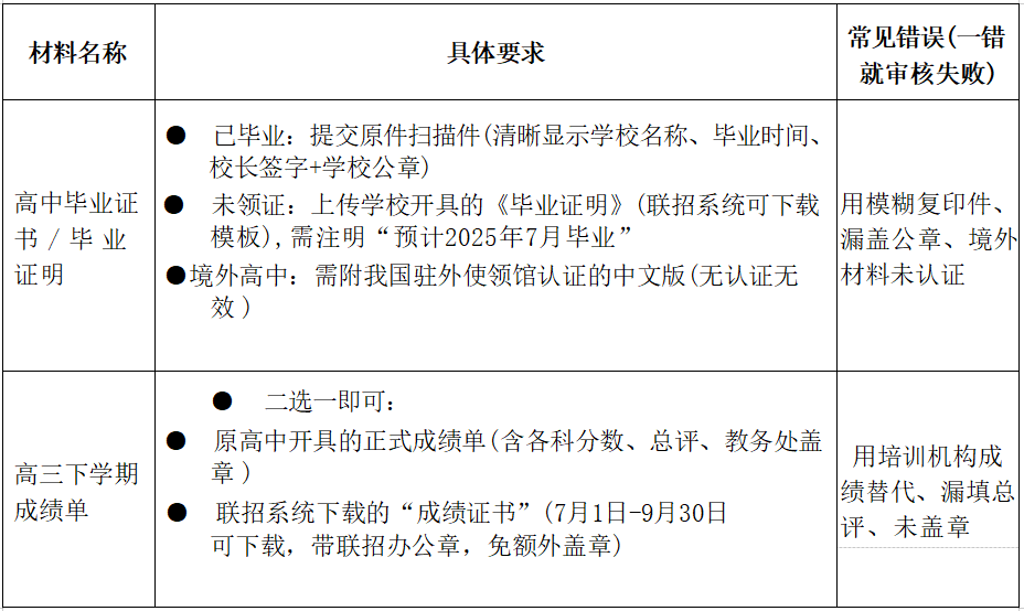 根据《2025 年全国联招招生简章》及联招办最新通知,未按时提交或材料不过关,将面临不可逆转的后果,往年已有考生因此遗憾退档: