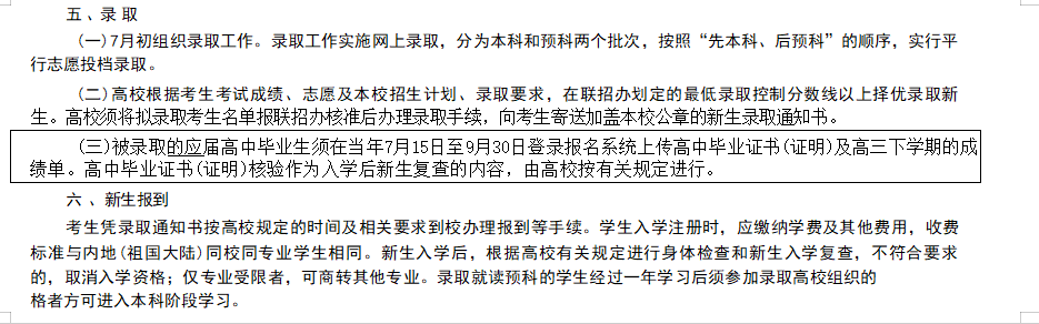 上传 “高中毕业证(证明)+ 高三下学期成绩单” ,是每一届港澳台侨联考学子闯过 “考试 +录取” 大关后,剩余的最后一公里路,倘若逾期未交或材料不合格,哪怕拿到录取通知书或已到大学报到,也会直接错失入学资格!