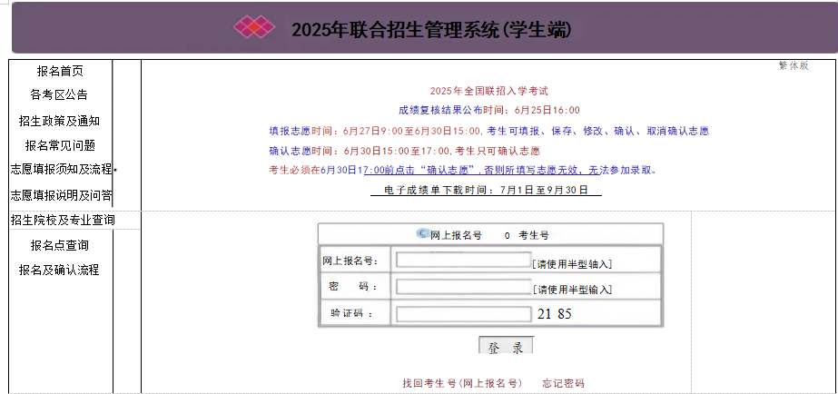 1、登录系统:打开“全国联招管理系统”(http://www.eeagd.edu.cn/lzks/),输入报名时的考生号、密码(忘记密码可通过手机号 / 邮箱重置)。