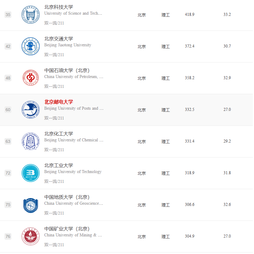 理工科强校表现抢眼:北京航空航天大学(全国第11名)和北京理工大学(全国第13名)作为“国防七子”成员,凭借其在航空航天、兵器科技等领域的专业优势,排名反超部分传统综合强校。