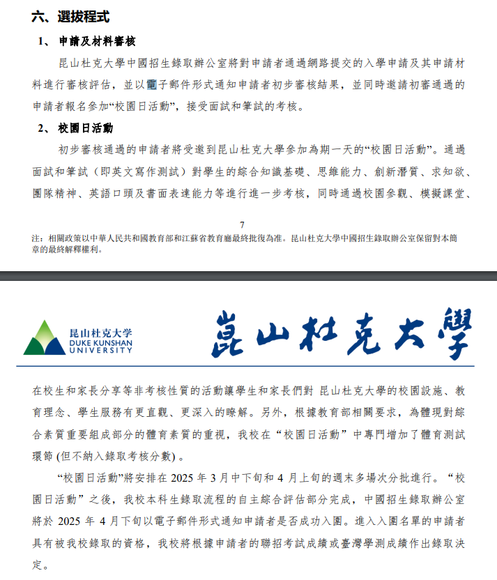 昆山杜克大学采用"综合评估+港澳台联考"模式,包括Slate线上申请、AI英语面试和校园日面试。