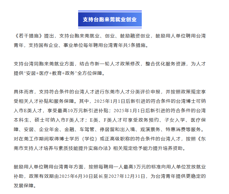 东莞对符合条件的台湾博士纳入市E类人才,提供最高10万元新引进补贴;用人单位每聘用一名台湾青年,可获最高3万元就业补助。