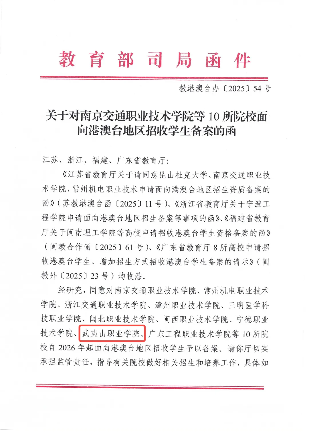 根据教育部港澳台事务办公室发布的《关于对南京交通职业技术学院等10所院校面向港澳台地区招收学生备案的函》(教港澳台办〔2025〕54号),共有10所高职院校新获批招收港澳台学生。