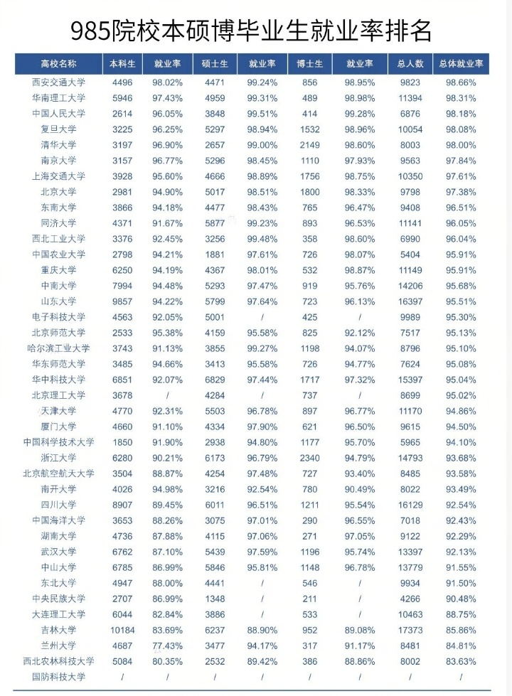 西安交通大学以98.66%的总体就业率位居榜首,本科、硕士和博士就业率均衡优异(分别为98.02%、99.24%和98.95%),体现出全层次培养体系下的高就业竞争力。