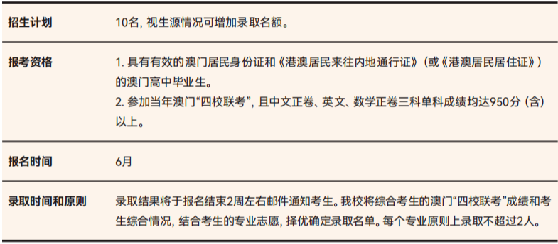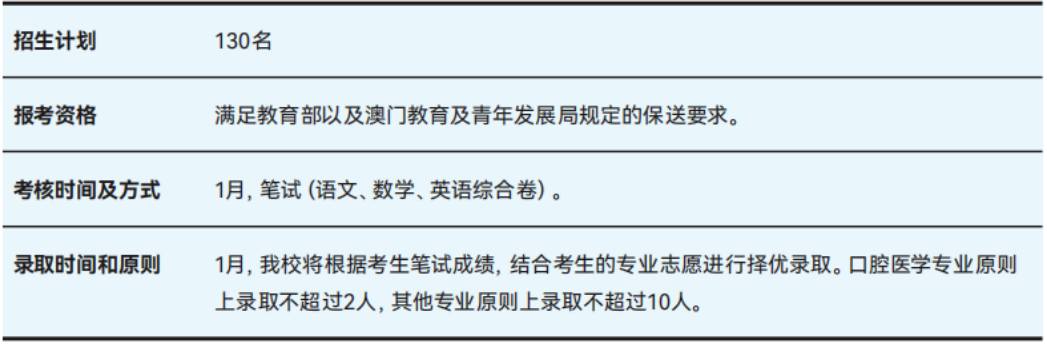澳门高中毕业生满足教育部及澳门教育及青年发展局规定的保送要求,通过笔试(语文、数学、英语综合卷)择优录取。