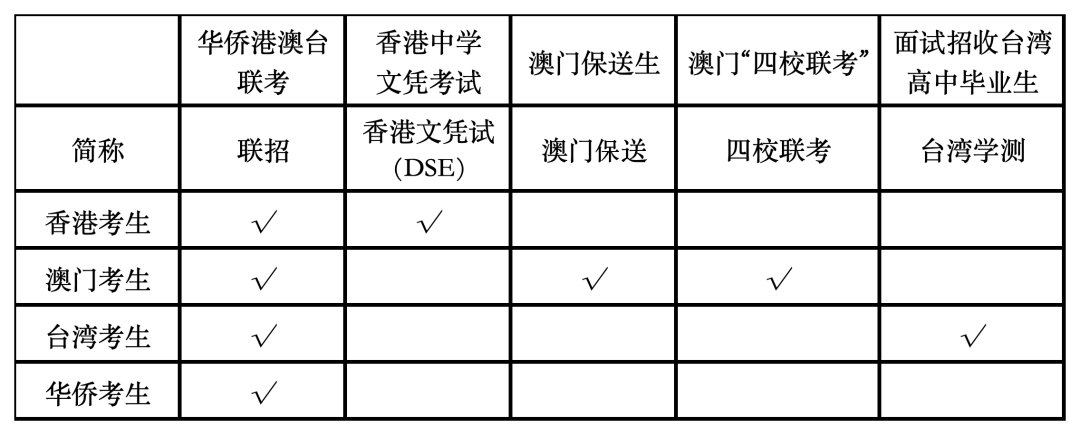 适用于持有港澳台居民身份或华侨身份的学生。考试科目包括中文、数学、英语、物理、化学/历史、地理(根据文理科选择)。