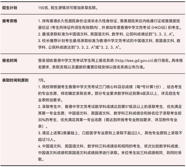 香港考生可通过DSE成绩申请,最低录取标准为中国语文科、英国语文科、数学科、公民科成绩达到“3、3、2、A”。
