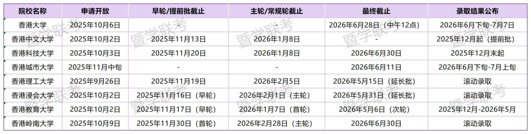 以下是香港八大院校针对2026学年本科入学申请的主要申请时间节点汇总,请务必以官方最新通知为准。