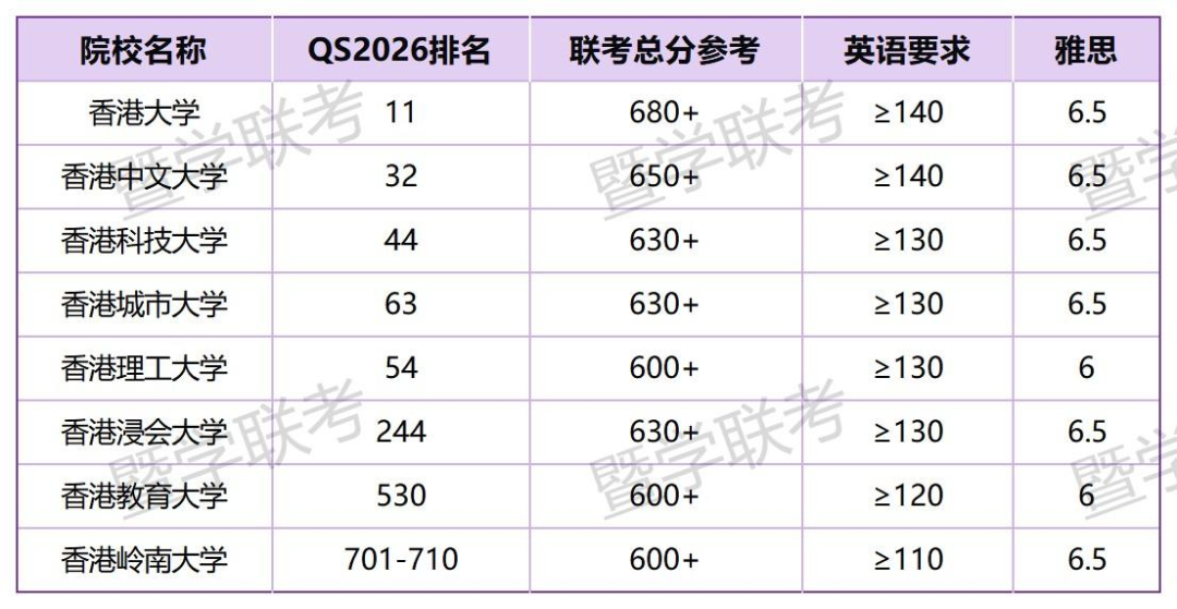 英语成绩:普遍要求联考英语单科成绩在120分以上,部分院校如香港大学要求甚至达到140分+。