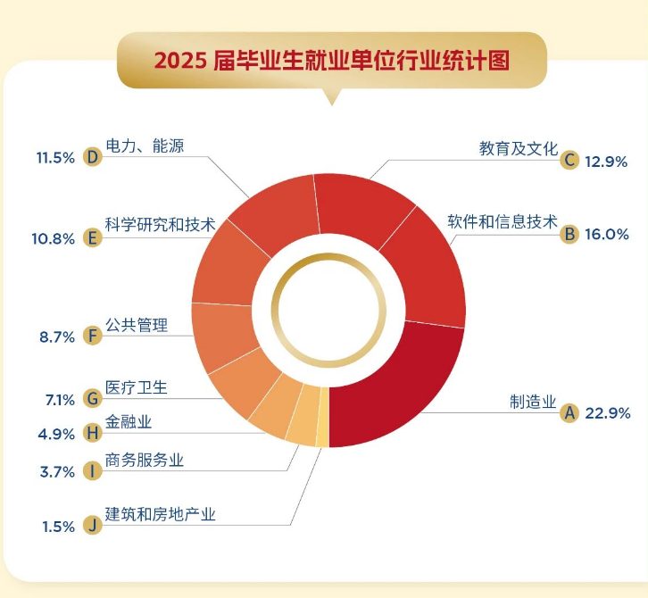 西安交大毕业生就业呈现“高精尖”特征。制造业是主要就业方向,占比22.9%;软件和信息技术服务业紧随其后,占比16.0%;科学研究与技术服务业占比10.8%。超过60%的毕业生进入国资委重点央企、世界500强企业。这种高浓度的优质就业,在全国高校中处于领先水平。