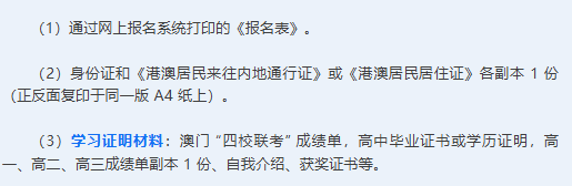 澳门学生可参加“两校联招”(暨南大学、华侨大学联合招生考试)或“全国联招”(全国普通高校联合招收华侨港澳台学生入学考试)。
