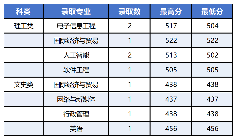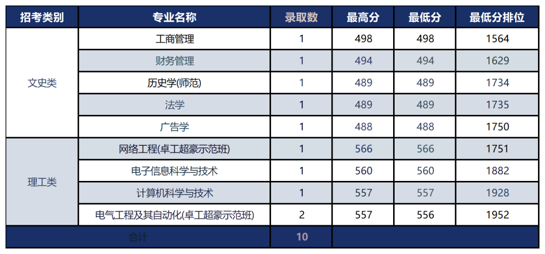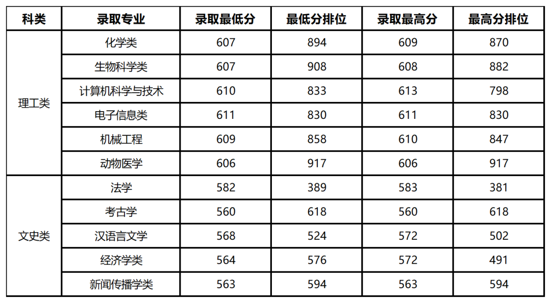理科:最低604分(英语),计算机科学与技术专业录取分最高(最低620分),电子信息工程紧随其后(最低617分),排位多在800—950名