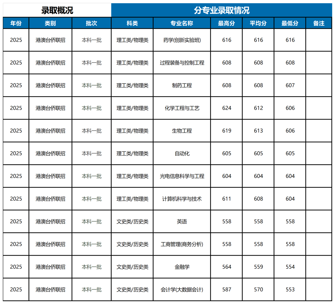 在化工、材料、制药等方向拥有长久优势,这些理工类专业录取分集中在604—616分。