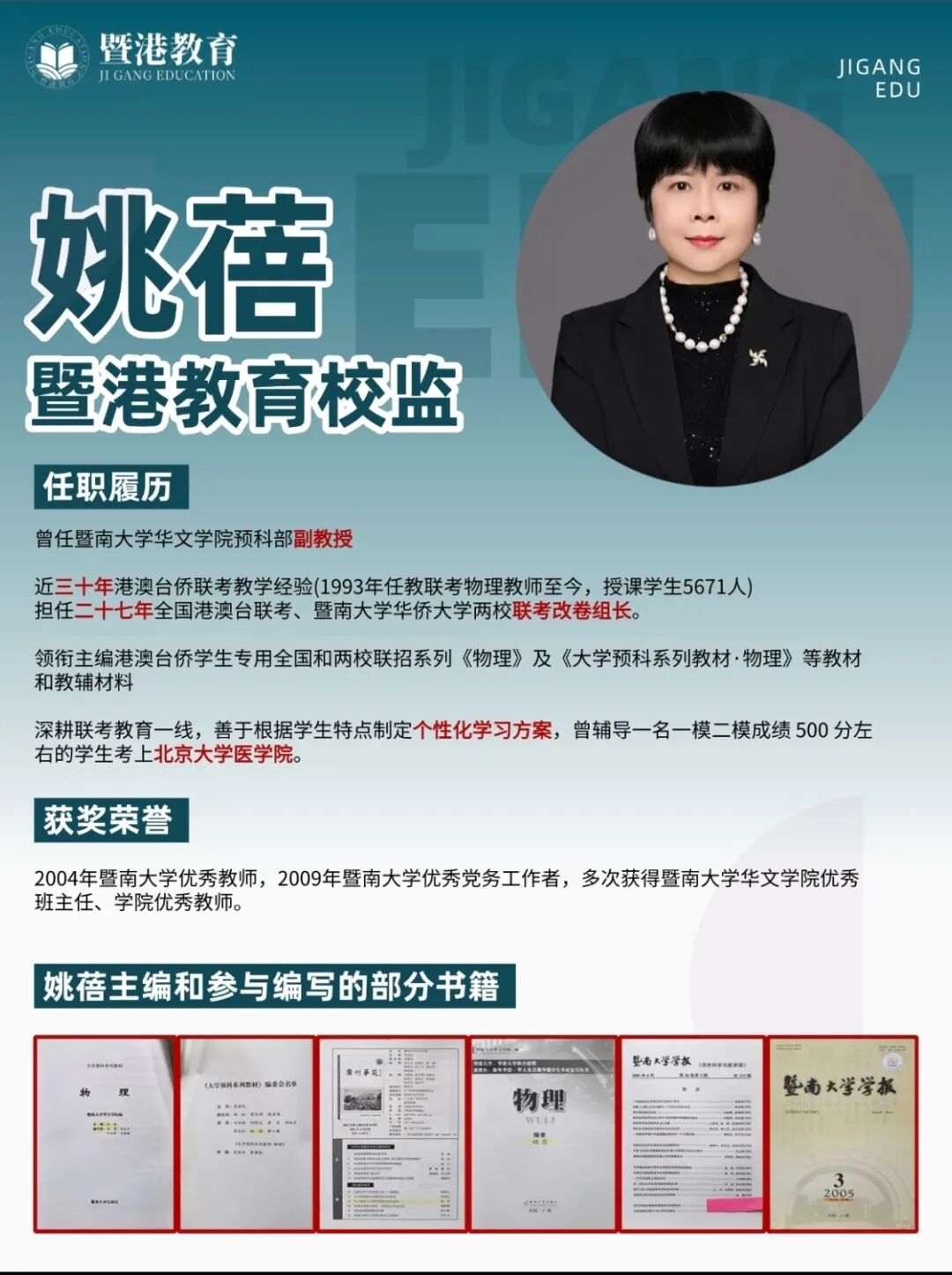 命题研究专家领衔:学校的教研负责人由姚蓓副教授担任。她原是暨南大学华文学院物理教师,拥有三十年港澳台联考教研经验,曾参与联考大纲编写和教材主编工作,对联考命题规律有着深刻理解。