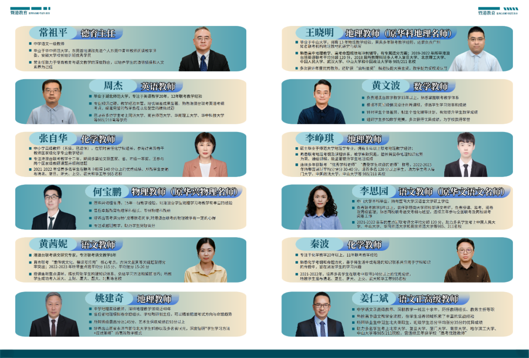 暨港教育的核心竞争力来自于其雄厚的师资团队和优质的教学资源。学校汇聚了一支由“联考专家+高考名师+资深联考教师”组成的一流教学团队,形成经验、专业与创新的互补优势。