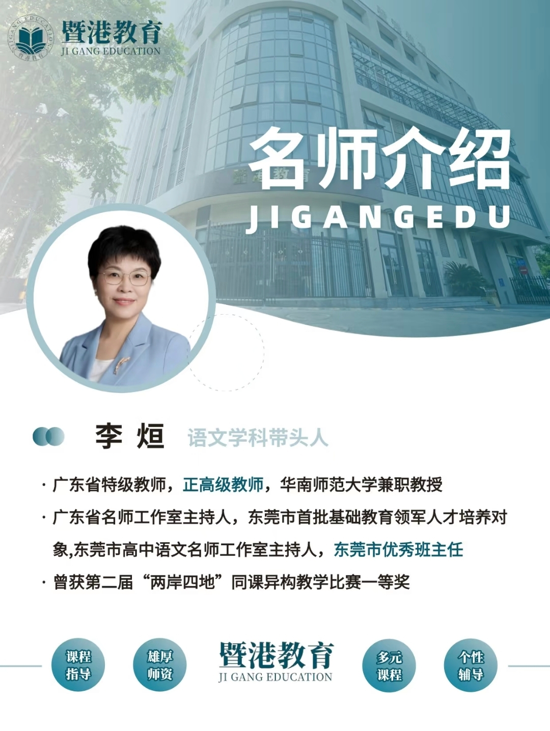 语文学科带头人李烜:广东省特级教师,正高级教师,华南师范大学兼职教授,广东省名师工作室主持人。