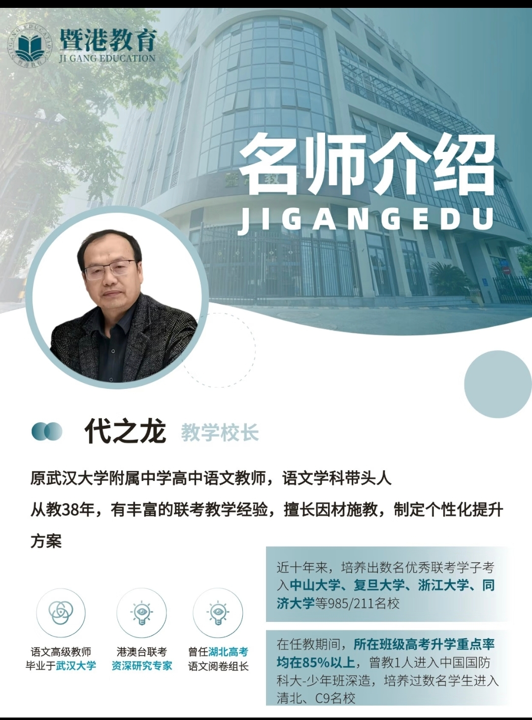 教学校长代之龙:是语文高级教师,从教38年,曾培养出数多名浙大、复旦、中大等名校生。