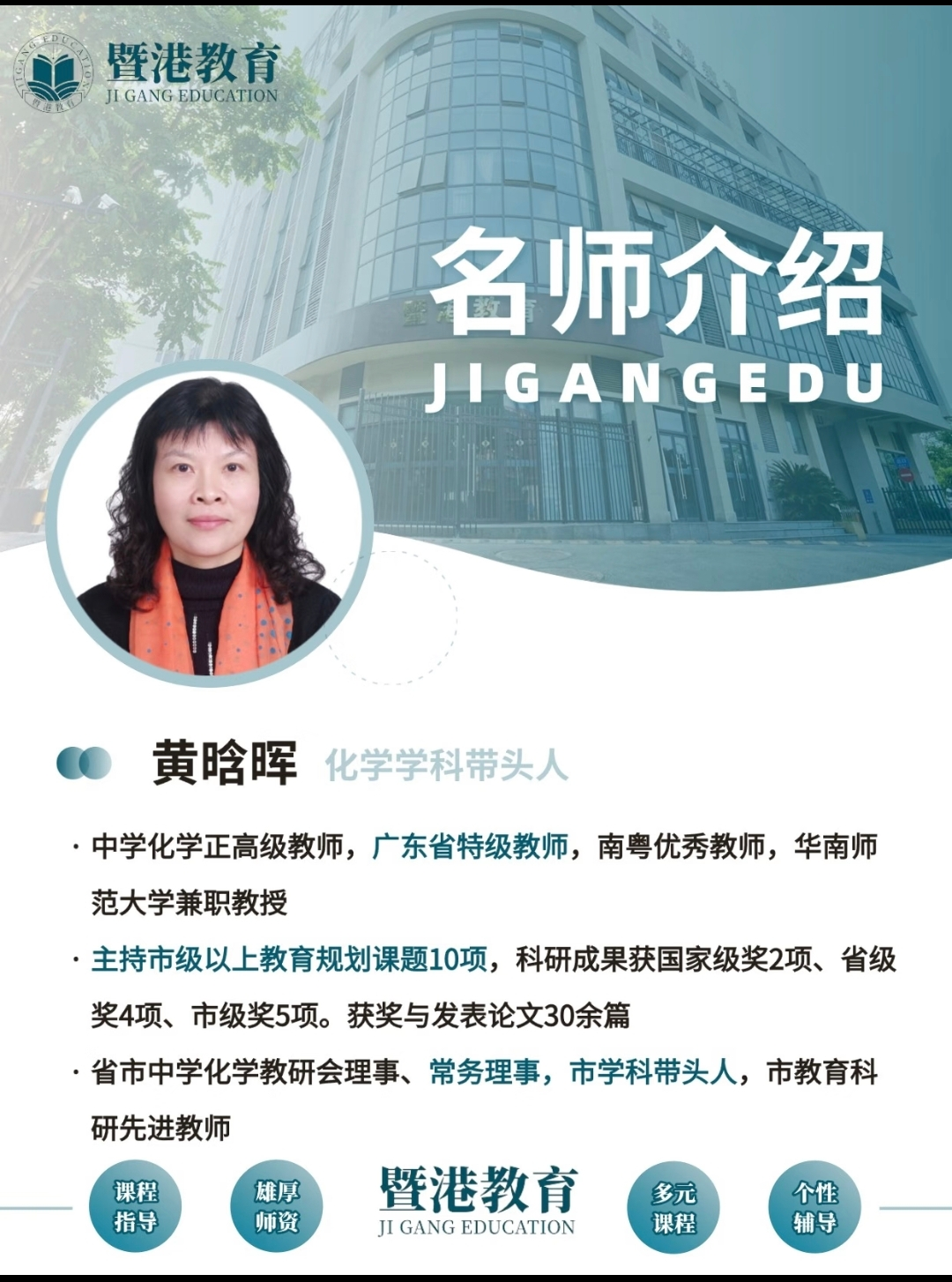 化学学科带头人黄晗晖:中学化学正高级教师,广东省特级教师,主持市级以上教育规划课题10项,科研成果获国家级奖2项。
