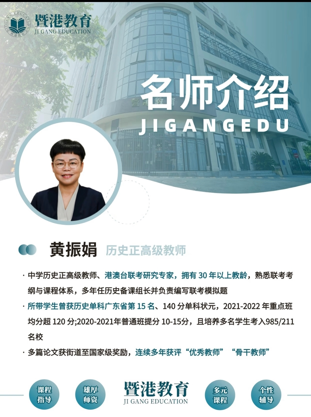 历史教师黄振娟:中学历史正高级教师、港澳台联考研究专家,拥有30年以上教龄,所带学生曾获历史单科广东省第15名。