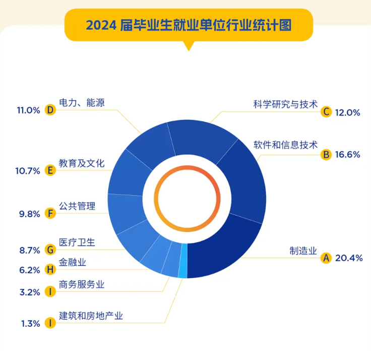 就业方向:就业行业分布广泛,涵盖了多个领域。制造业是毕业生的主要就业方向,占比最高,达到20.4%。软件和信息技术行业紧随其后,占比16.6%,科学研究与技术行业占比12.0%。