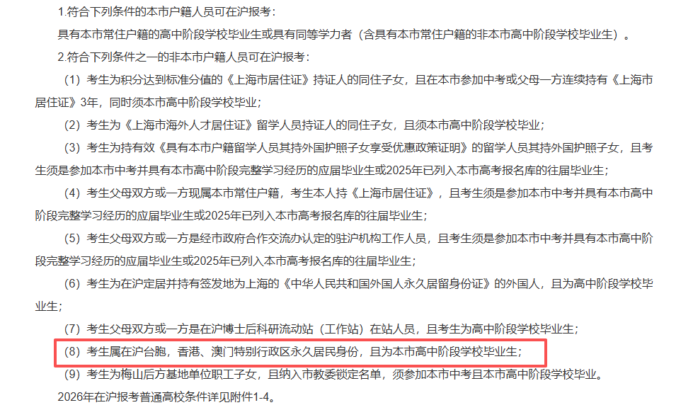 上海市:允许在沪就读的港澳台学生凭本地高中学籍兼报联考与高考。