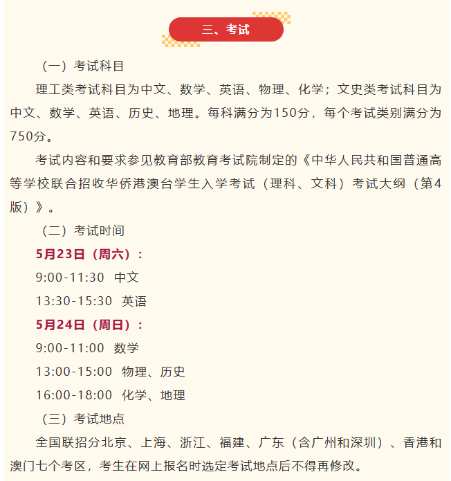 全国联招设七个考区:北京、上海、浙江、福建、广东(含广州和深圳)、香港和澳门。考生报名时选定考试地点后不得修改。