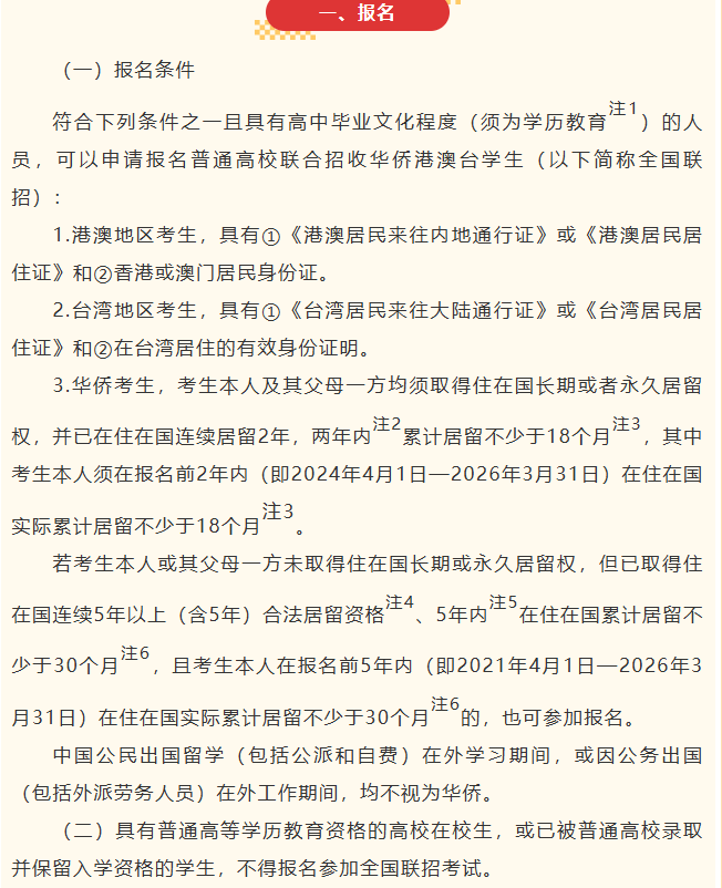 华侨考生:本人及其父母一方均须取得住在国长期或永久居留权,并满足居留时间要求