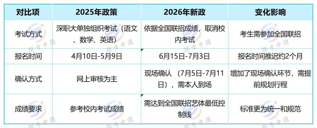 深职大新政最大的变化是考生必须参加2026年全国联招考试并达到本科批次艺体类最低录取控制分数线。全国联招报名于3月1日开始,考试在5月23-24日举行。