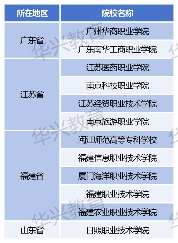 南京交通职业技术学院、常州机电职业技术学院、浙江交通职业技术学院、漳州职业技术学院、三明医学科技职业学院、闽北职业技术学院、闽西职业技术学院、宁德职业技术学院、武夷山职业学院、广东工程职业技术学院。
