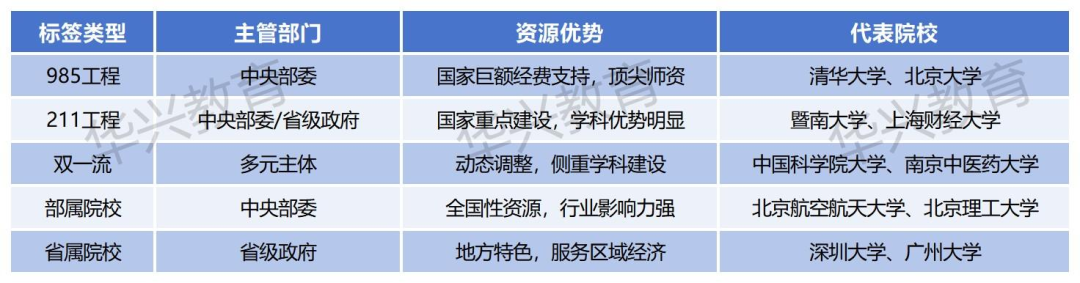 下表清晰展示了五大院校标签的核心区别: