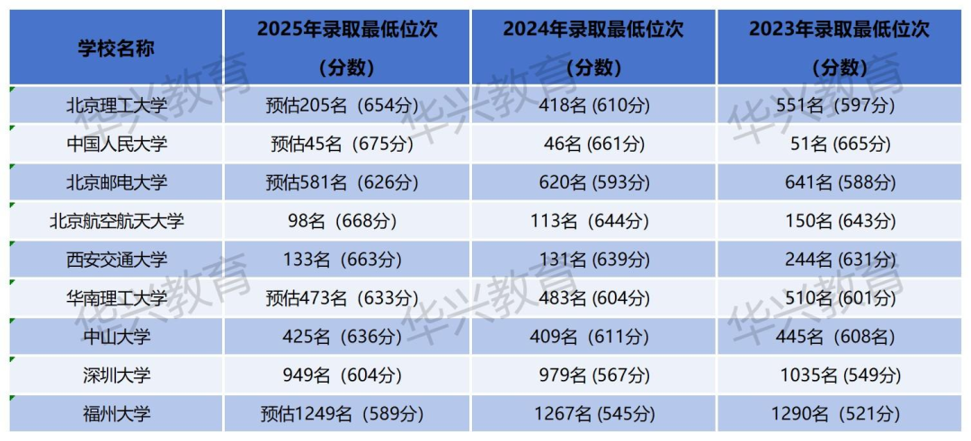 下表汇总了2023年至2025年部分关注度较高的院校理科(理工类)录取最低分数及对应的大致位次。