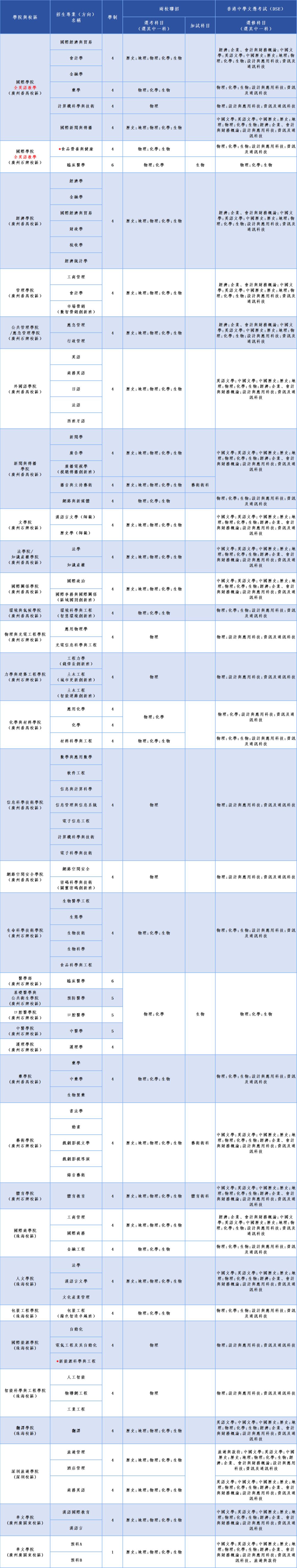 (1)2026年以香港中學文憑考試(DSE)成績報讀我校的具體要求詳見我校招生信息網《2026年香港中六畢業生憑DSE成績申請入讀暨南大學報名指引》(預計將於2026年5月公佈)。