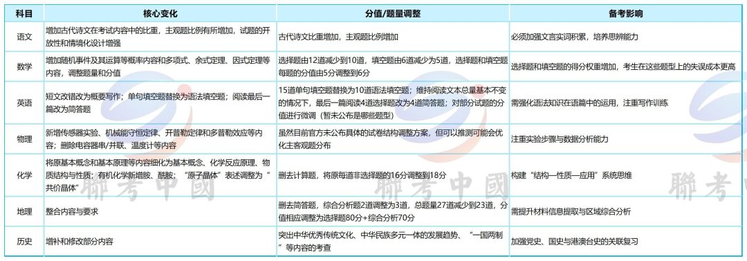 此次修订覆盖语文、数学、英语、物理、化学、历史、地理七大学科,整体呈现“内容扩容、能力导向、综合考查”三大特点。