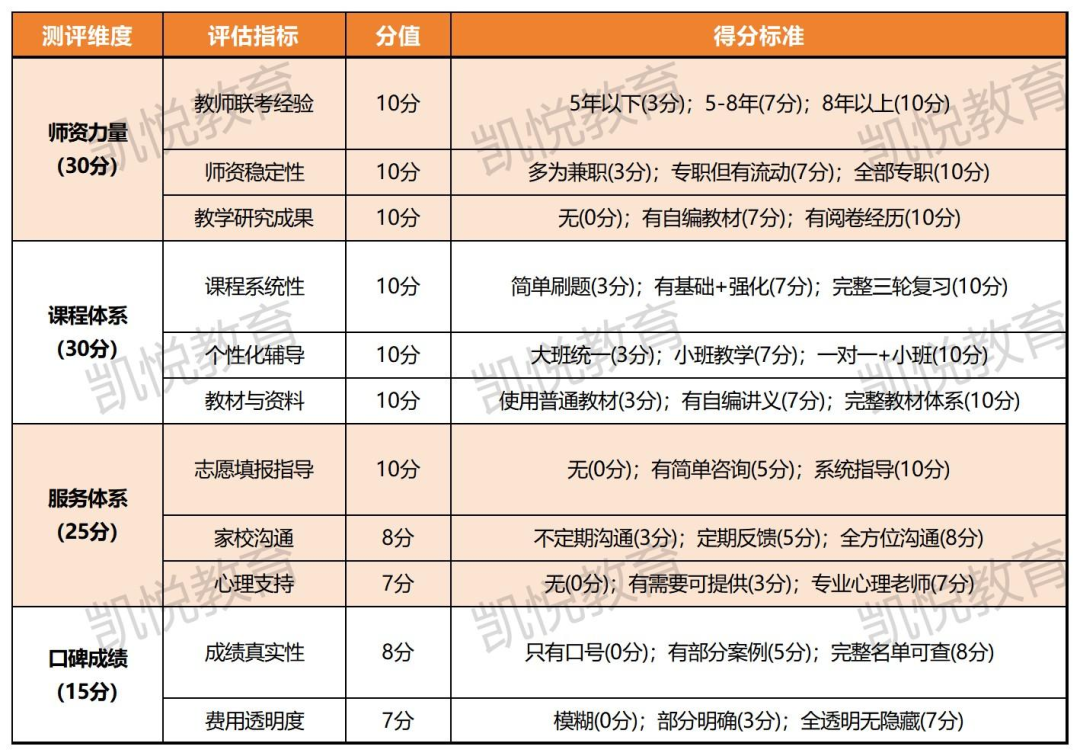 下表为您提供一套实用的量化评估工具(满分100分),助您系统考察机构。