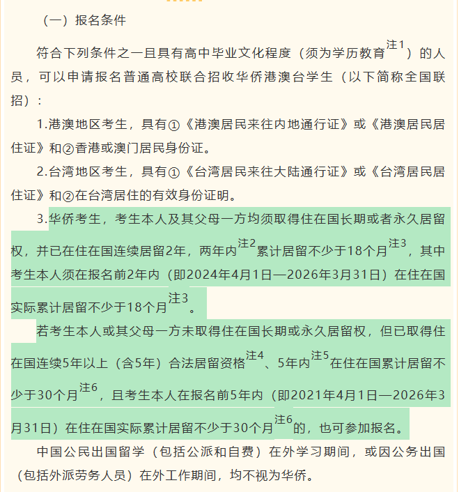 留学、公务出国人员不视为华侨,其居留时间不计入考核,不满足要求不可报名。