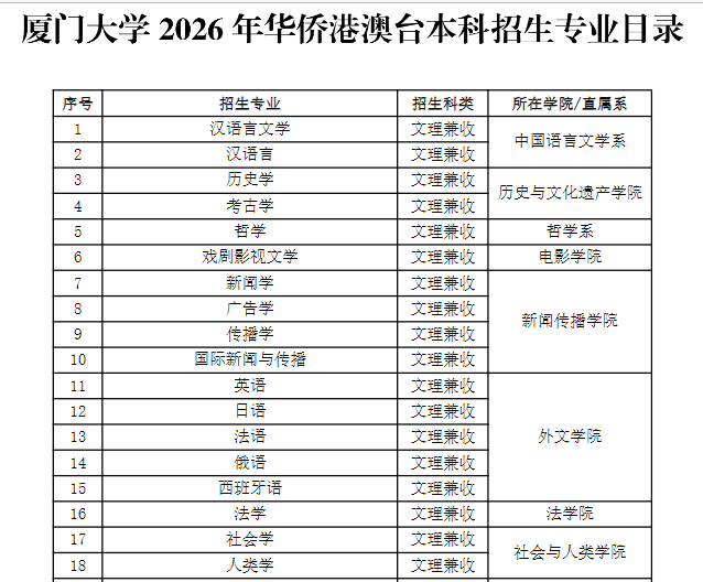 厦门大学公布了2026年华侨港澳台本科招生专业目录,与往年相比,最显著的变化在于招生模式的根本性调整。
