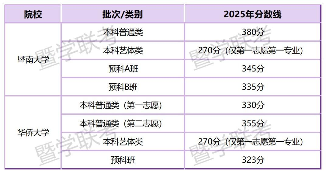 暨大预科A班:2023年350分→2024年345分→2025年345分,整体在345-350分区间。