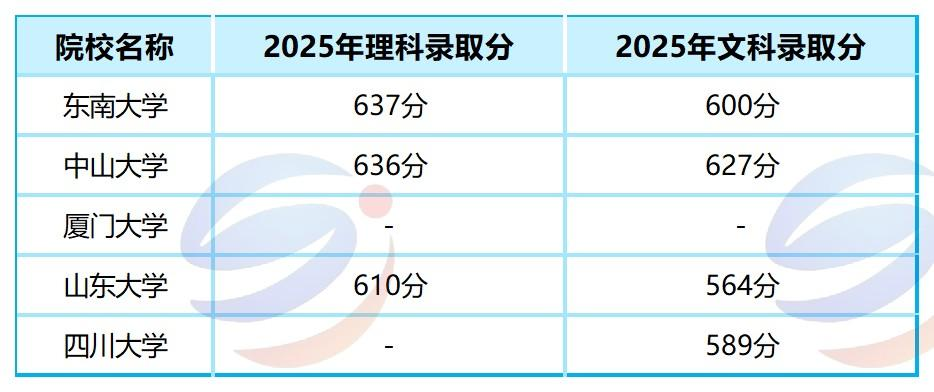 第二梯队是600分考生可以重点关注的区间。理科600分可考虑厦门大学(610分)、山东大学(610分)等;文科600分可尝试东南大学(600分),但中山大学(627分)对文科考生要求更高。
