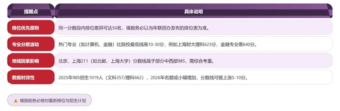 同一分数段内,排位差异可能达到50名。例如,理科636分的情况下,武汉大学与中山大学的录取分数线相同,但排位不同,填报时务必以当年联招办发布的排位表为准。