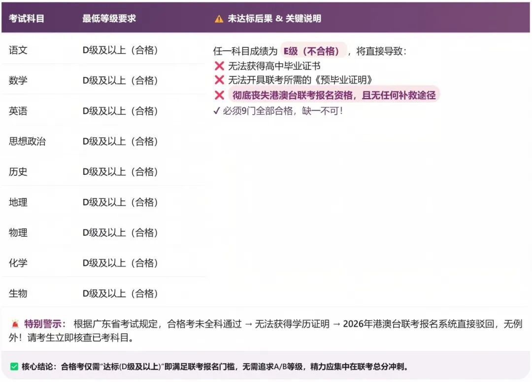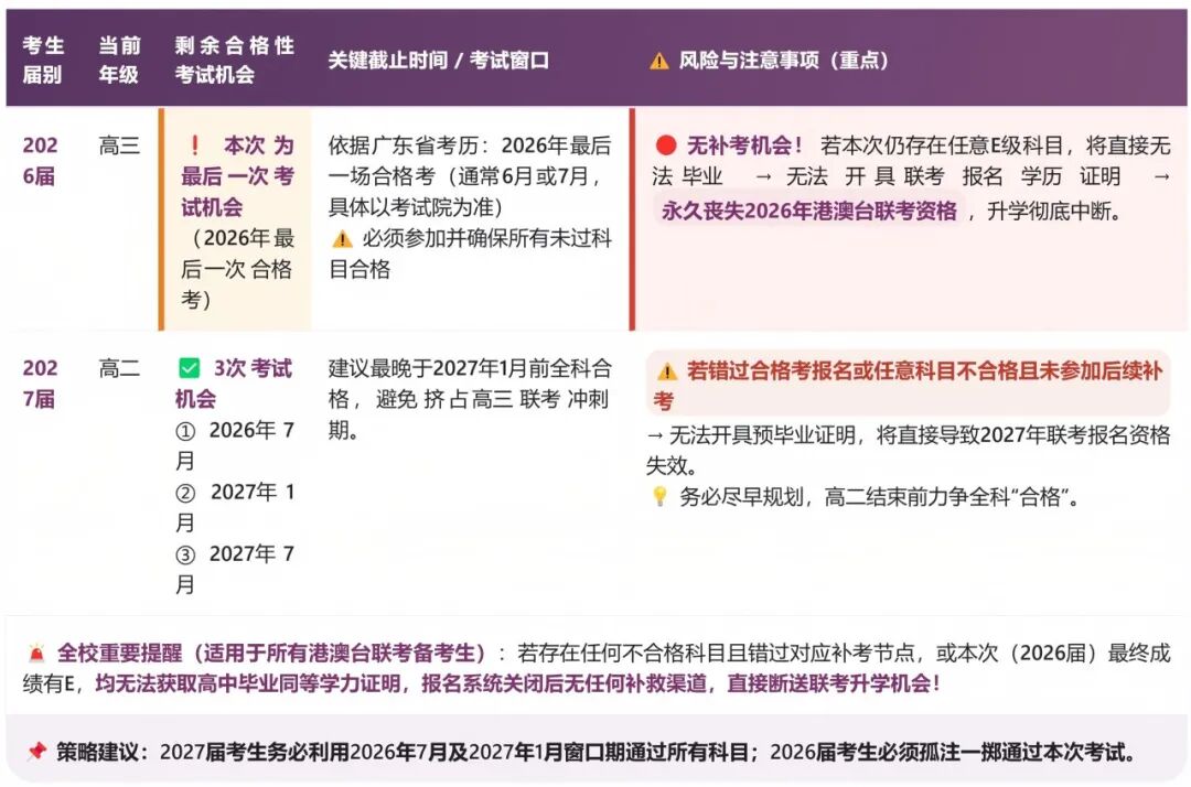特别提醒:若有任一科目成绩为E级(不合格),考生将无法正常毕业,亦无法开具联考报名所需的学历证明,直接丧失2026年港澳台联考的报名资格,且无补救途径。