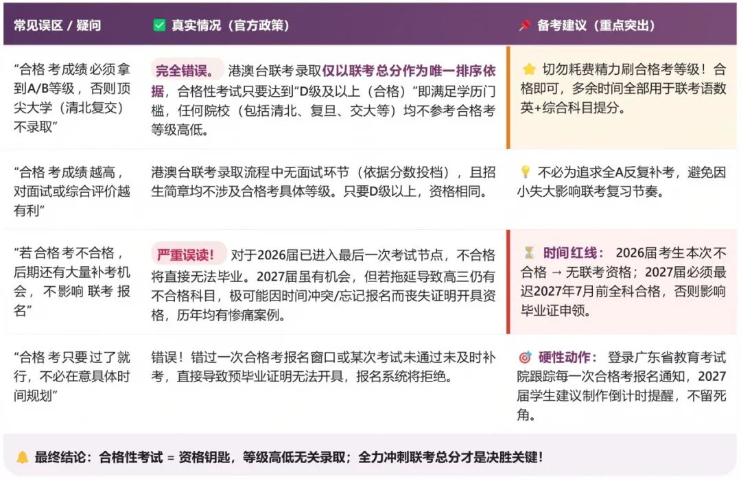 目前,2026届、2027届计划参加港澳台联考的考生中,仍有部分人未充分认识到合格性考试的重要性,甚至存在“合格考与港澳台联考无关”的错误认知。这一观点存在严重偏差,必须予以纠正。